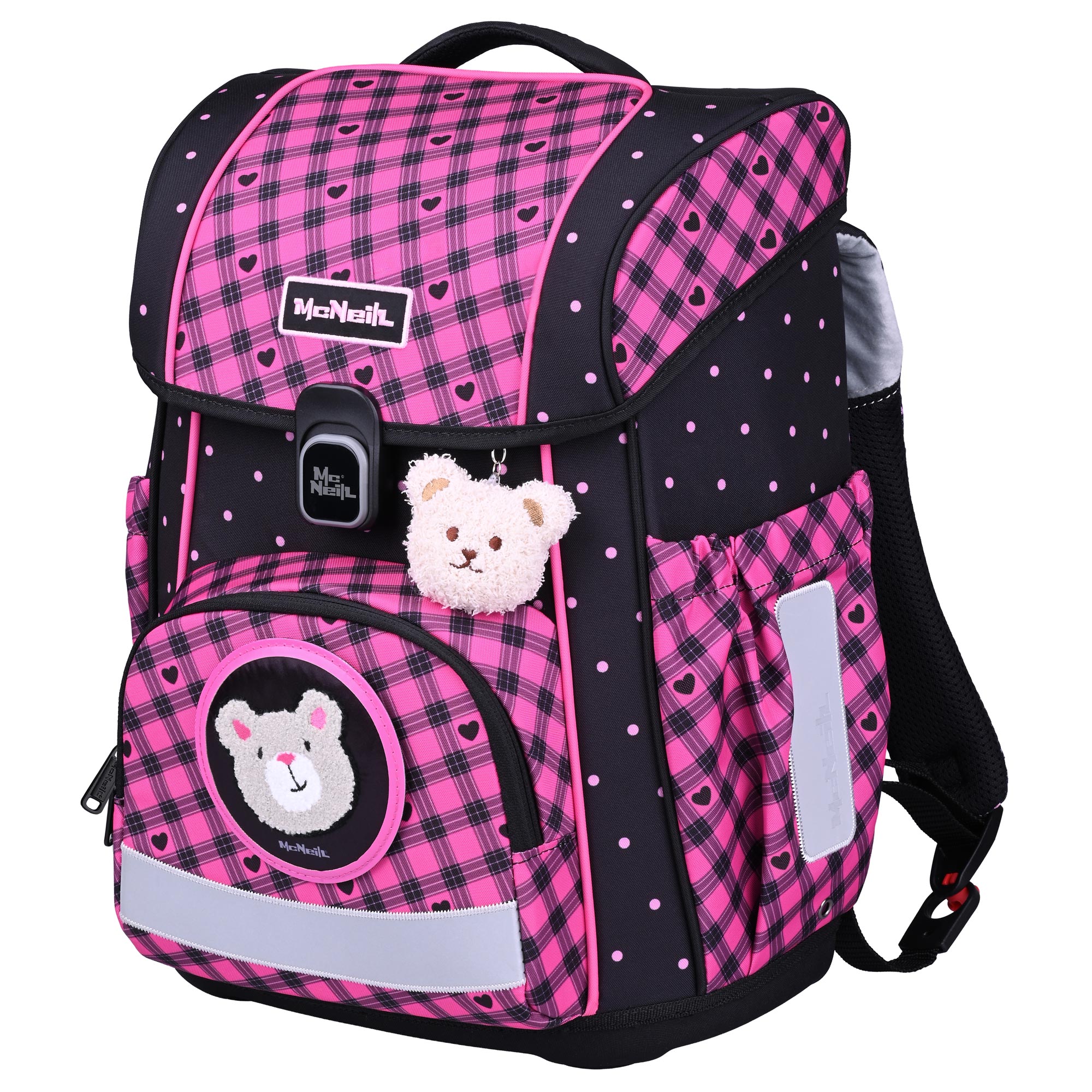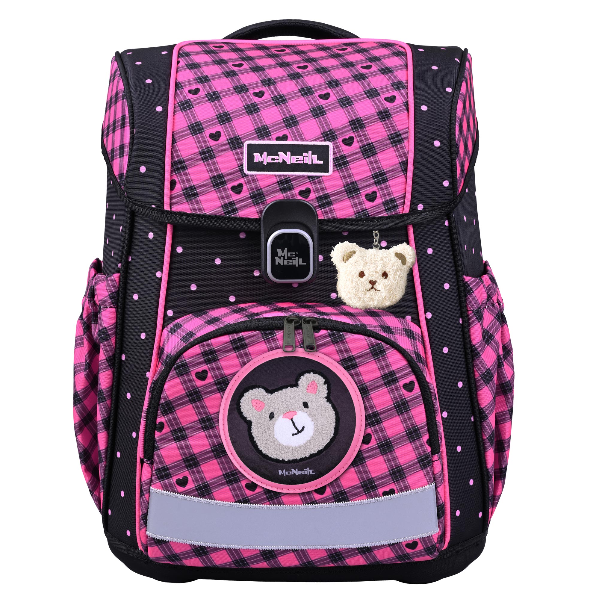 Der Bravo Buddy-Schulranzen verbindet Funktionalität und Stil mit einem süßen schwarz-rosa Design. Enthält zwei süße beflockte McAddys, pinkfarbene Brotdose und Trinkflasche. Das Design für Mädchen die kuschelige Teddys und Herzen lieben.
