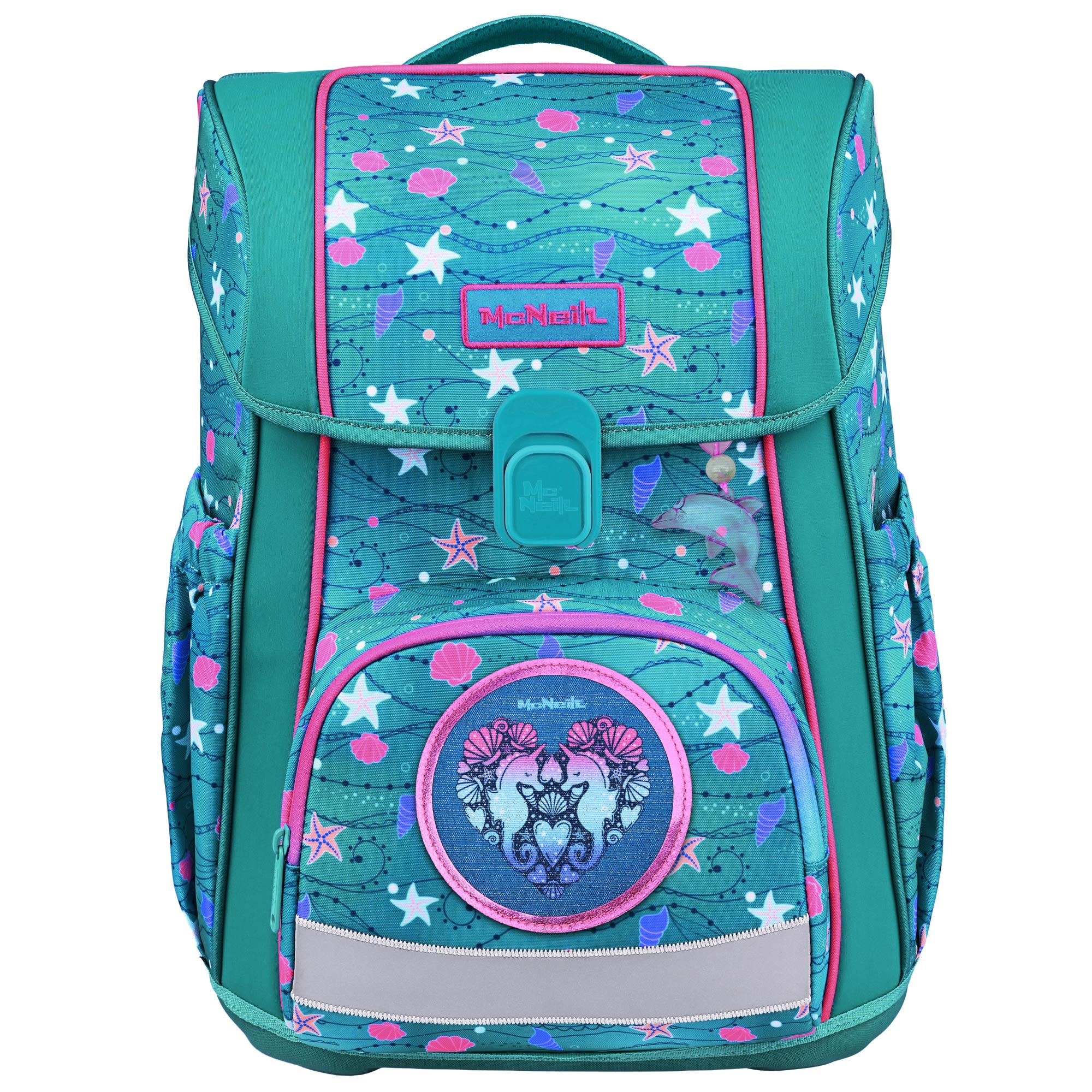 Der Bravo Seafisch-Schulranzen verbindet Funktionalität und Stil mit einem verspielten Meeresdesign in türkis. Enthält zwei süße McAddys, pinkfarbene Brotdose und Trinkflasche. Das Design für Mädchen die Seepferdchen lieben.