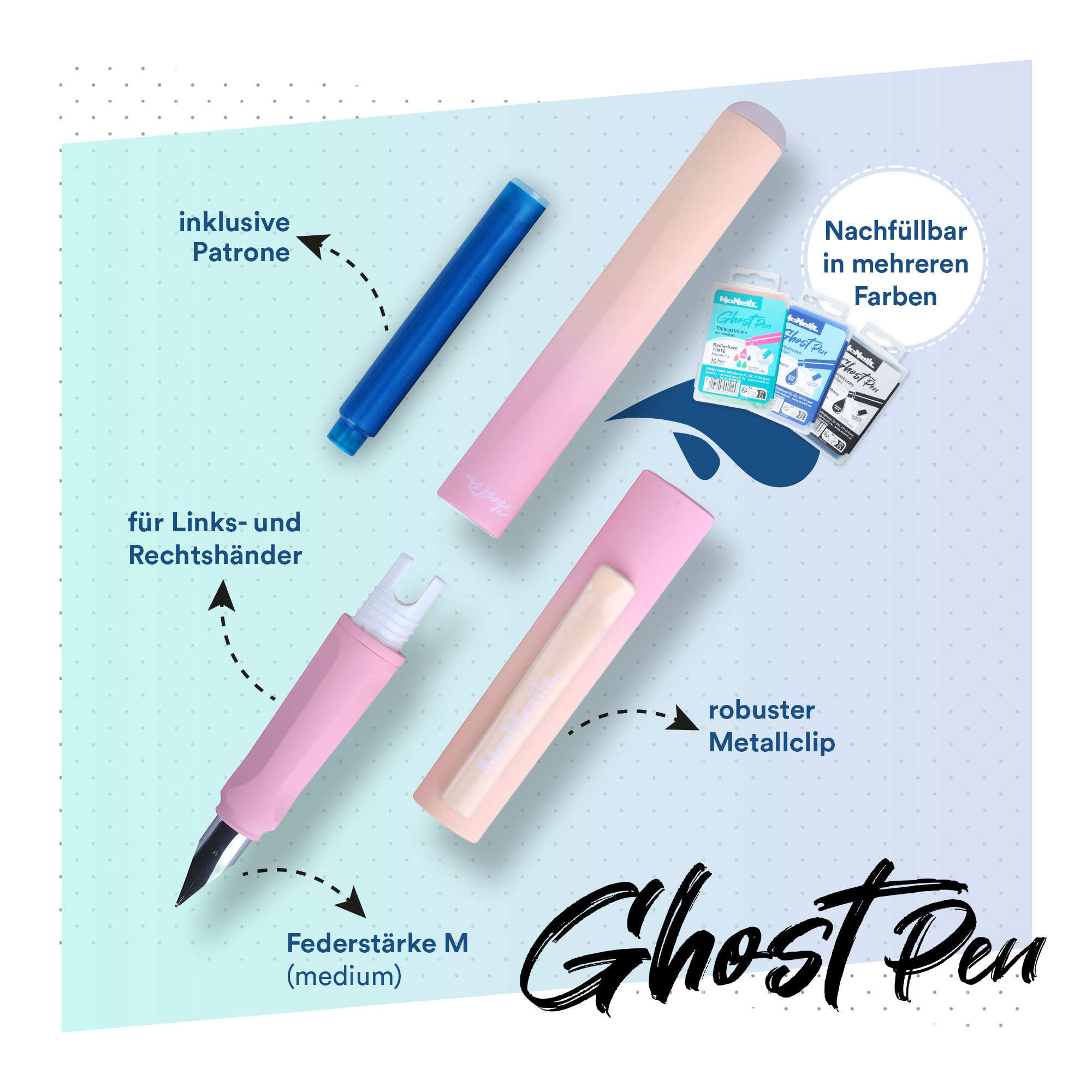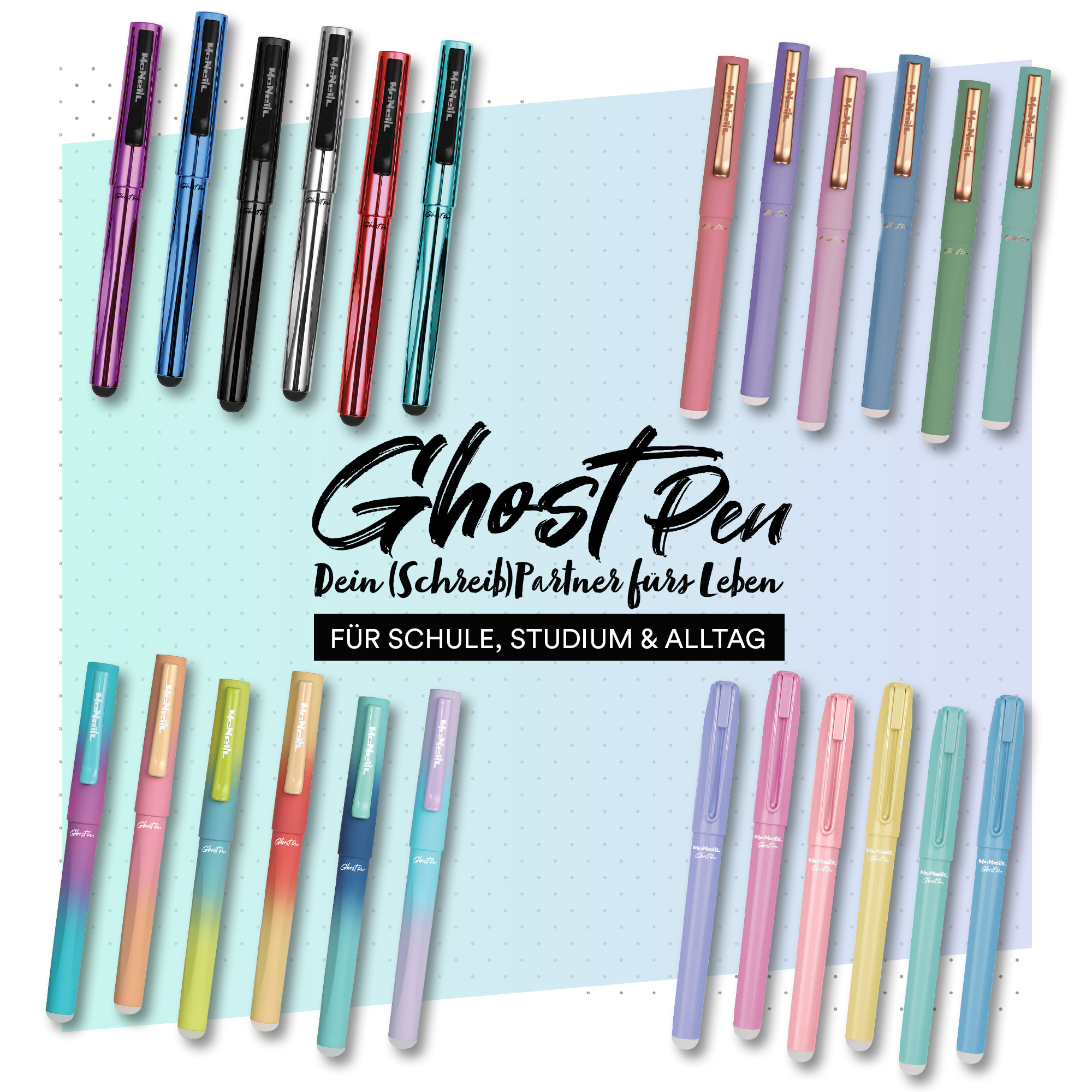 Der McNeill Ghost Pen schreibt wie ein echter Füller – lässt sich aber ganz einfach korrigieren. Dank radierbarer Tinte korrigierst du Fehler im Handumdrehen, ganz ohne Tintenlöscher oder Schmiererei, sofort wiederbeschreibbar. Schreiben – löschen – schreiben!“