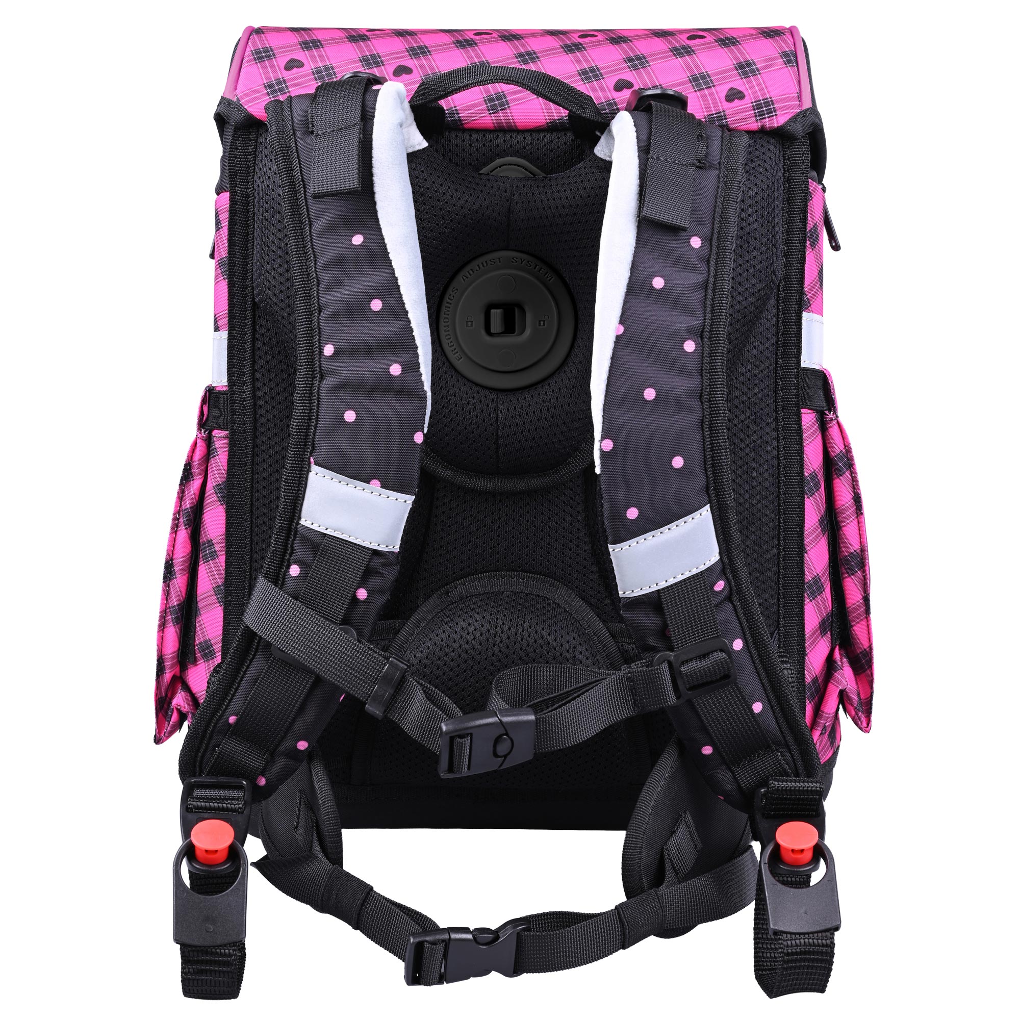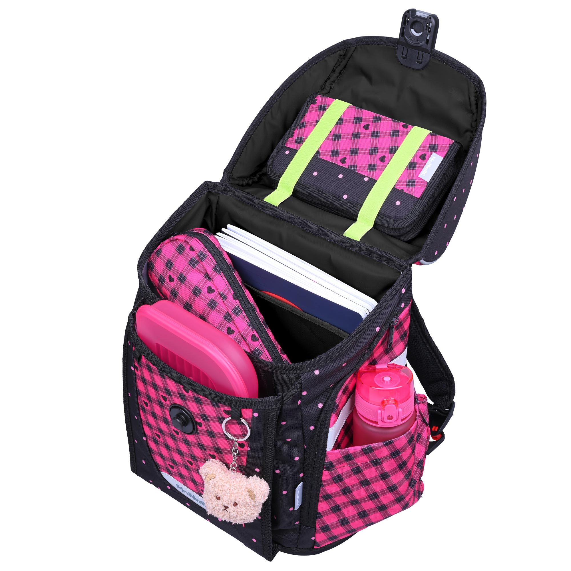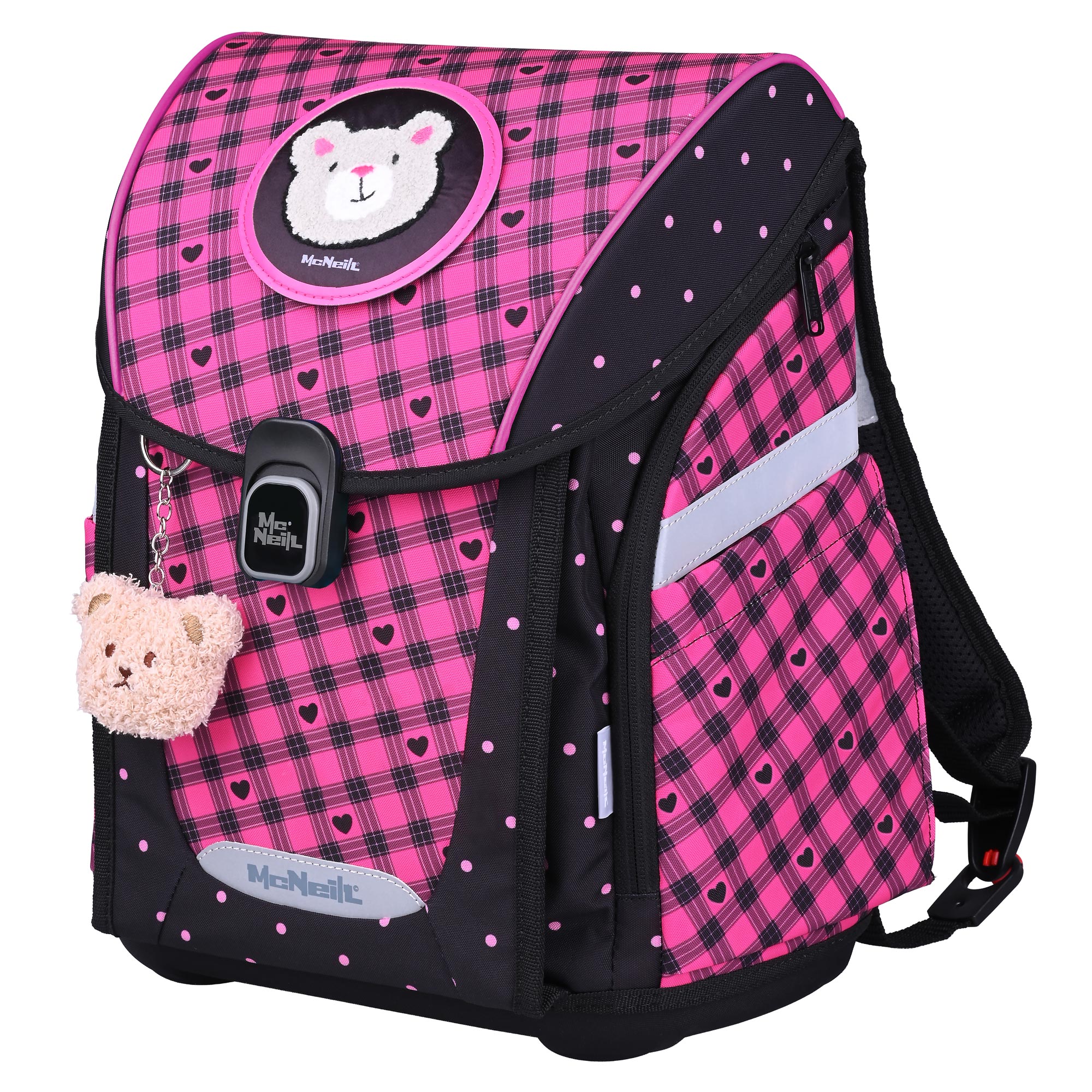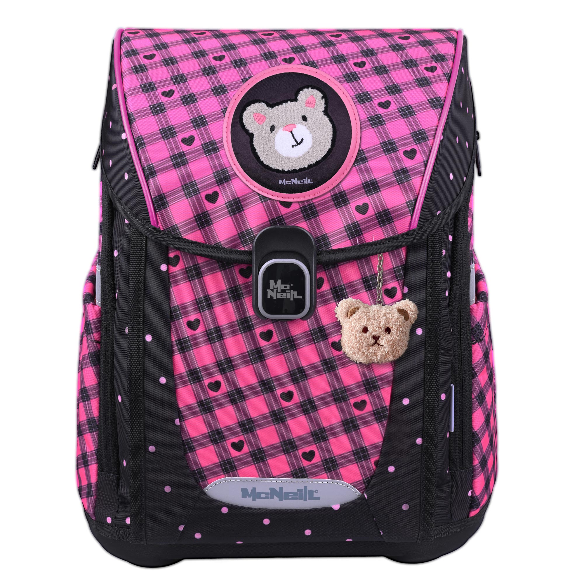 Der Primo Buddy-Schulranzen verbindet Funktionalität und Stil mit einem süßen schwarz-rosa Design. Er enthält zwei süße beflockte McAddys, pinkfarbene Brotdose und Trinkflasche. Das Design für Mädchen die kuschelige Teddys und Herzen lieben.