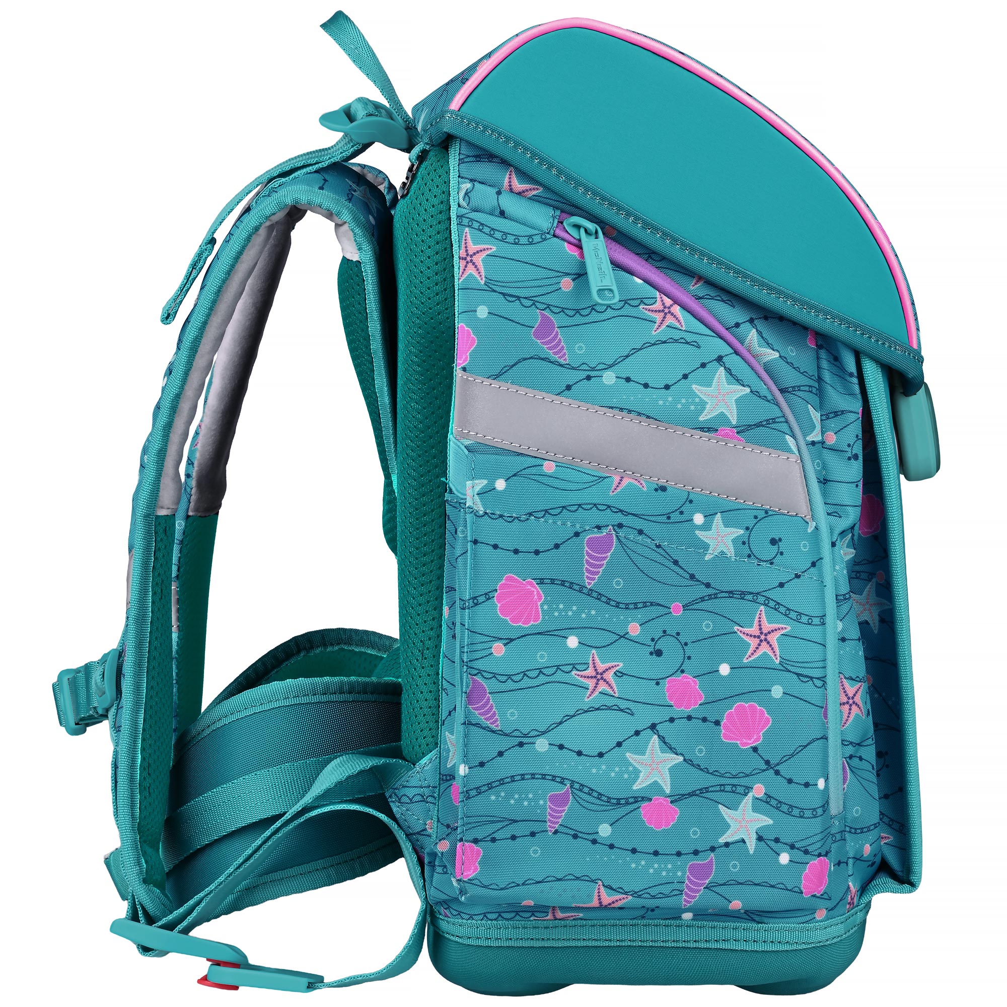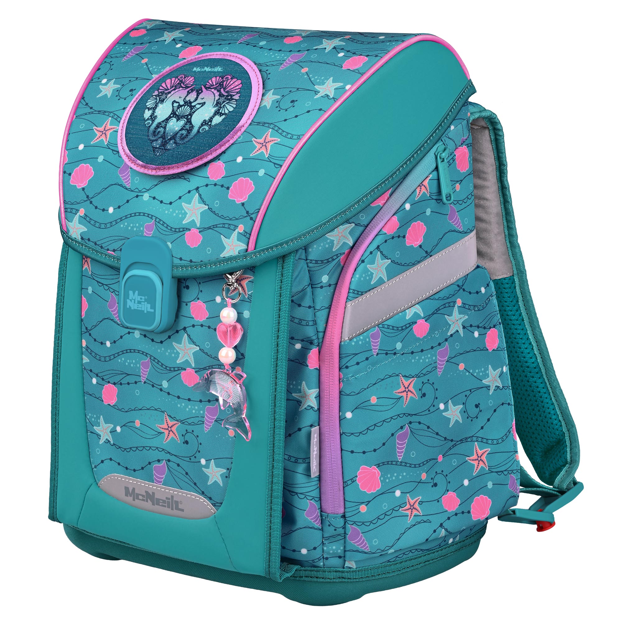 Der Primo Seafisch-Schulranzen verbindet Funktionalität und Stil mit einem verspielten Meeresdesign in türkis. Er enthält zwei süße McAddys, pinkfarbene Brotdose und Trinkflasche. Das Design für Mädchen die Seepferdchen lieben.