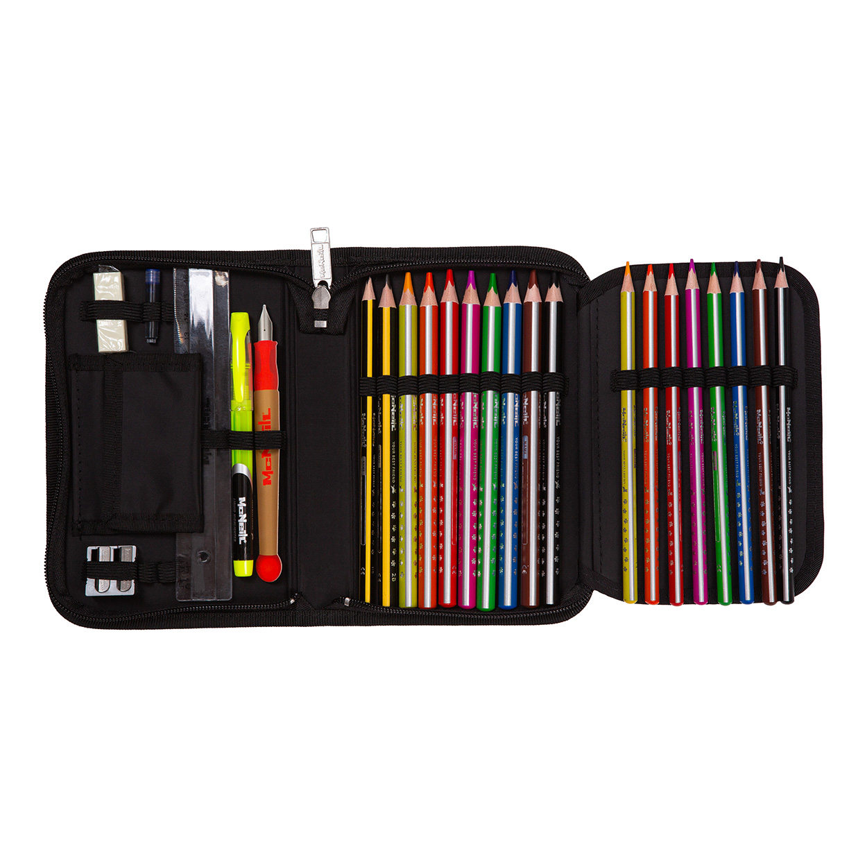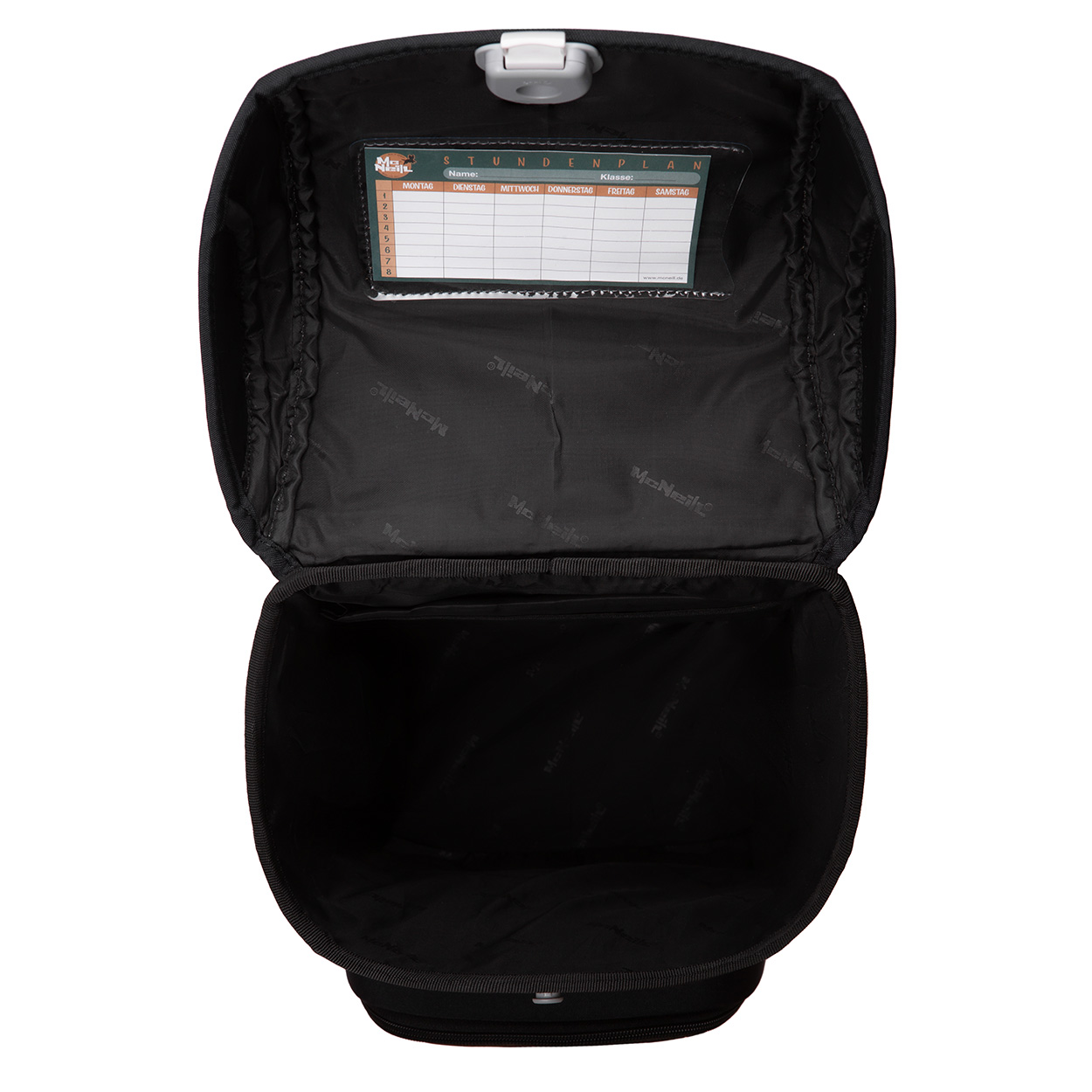 Das McNeill BASIC Ranzen-Set mit gefülltem Etui, Schlamperrolle und Sportschuhbeutel. Endlich ein Schulranzen, der ganz bequem gepackt werden kann – auch wenn die Brotdose mal etwas größer ausfällt oder ein Spielzeug mit in die Schule soll. Mir Air-Flow Rücken, abnehmbaren Bauch- und Brustgurt und Gummizugtaschen. Bücherfach im Inneren.