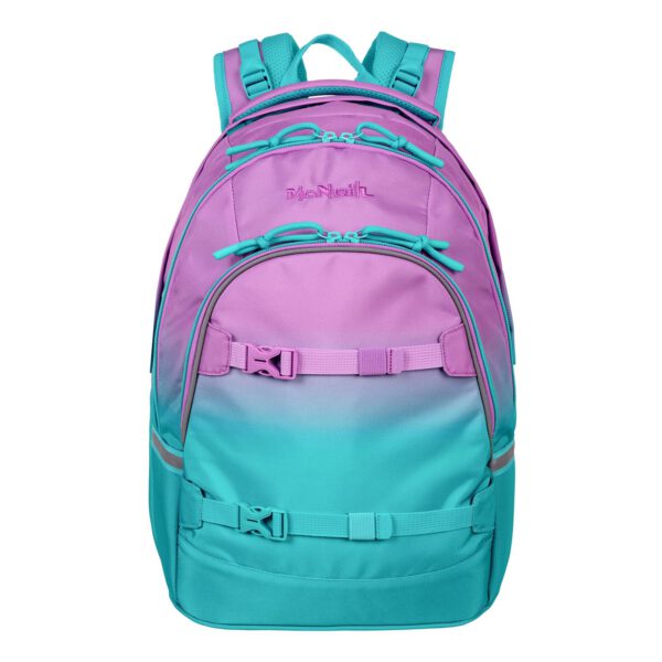 Der neue Schulrucksack MILO von McNeill. Die gepolsterten Rückriemen verleihen ein angenehmes und softes Tragegefühl und die eingearbeiteten Gummibänder verstärken diesen Tragecomfort in dem sie eine nachfedernde Eigenschaft haben. Die Ausstattung mit einem großen Hauptfach mit integrierten Bücherfach, Mittelfach mit Reißverschluß Innentasche und dem Frontfach mit 2 Reißverschluß Taschen, Organizer und Gurt mit Karabiner runden den Schulrucksack ab. Die trendigen Farben lassen den Schulalltag bunt erscheinen. Mit abnehmbaren Beckengurt und einstellbaren Brustgurt, der verstärkte wasserdichte Boden sorgt für einen sicheren Stand. Für die Belüftung am Rücken sorgt unser Air-Flow Rückensystem.