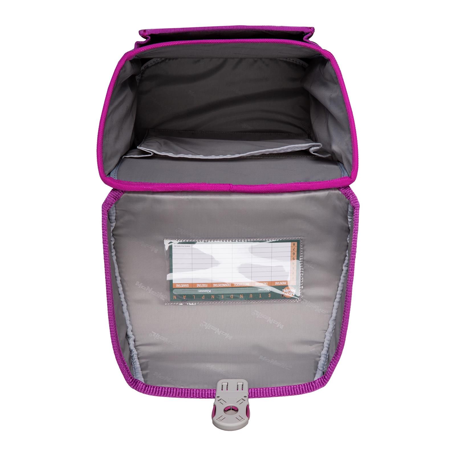 McNeill Tenero – Kollektion 2025- unser neuer stylisches Leichtgewicht. Mit der funktionellen Innenaufteilung, dem stylischen reflektierenden Magnetschloss. Alle unsere Ranzen 2024 sind mit dem ClickFlex Rückensystem ausgestattet. Der McAddy auf der Front ist wechselbar oder einfach ohne McAddy tragen. Die Seitenfächer sind mit Reißverschluss ausgestattet, für die Trinkflasche, Schirm etc.. Mit verstellbaren Bauch- und Beckengurt. Durch die gepolsterten Schultergurte, ein angenehmes Tragegefühl. Die reflektierenden Doppelstreifen sorgen für die gute Sichtbarkeit im Straßenverkehr.
